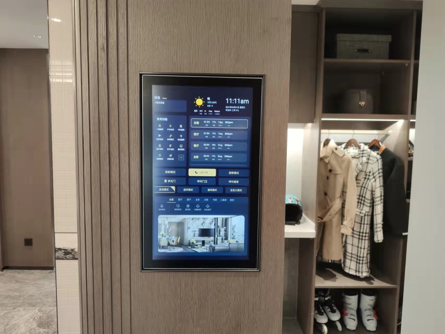 智能大屏以高端住宅为平台,通过物联网技术将小区内各区域以及家庭的各种设备连接到一起,实现智能化的一种生态系统设备。它具有智能灯光控制、智能电器控制、安防监控系统、可视对讲系统、智能化梯控等功能。利用网络通信技术、安全防范技术、自动控制技术、音视频技术集成家居生活有关的设施,提升家居安全性、便利性、舒适性、艺术性,并实现环保节能的居住环境。